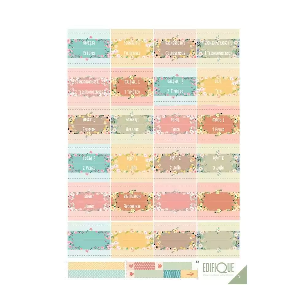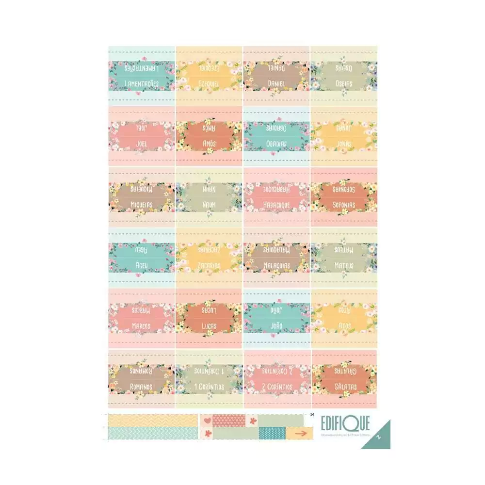 São 66 livros, de Gênesis a Apocalipse. As cartelas também contêm adesivos decorativos para recortar e usar e outros com espaço para anotar.