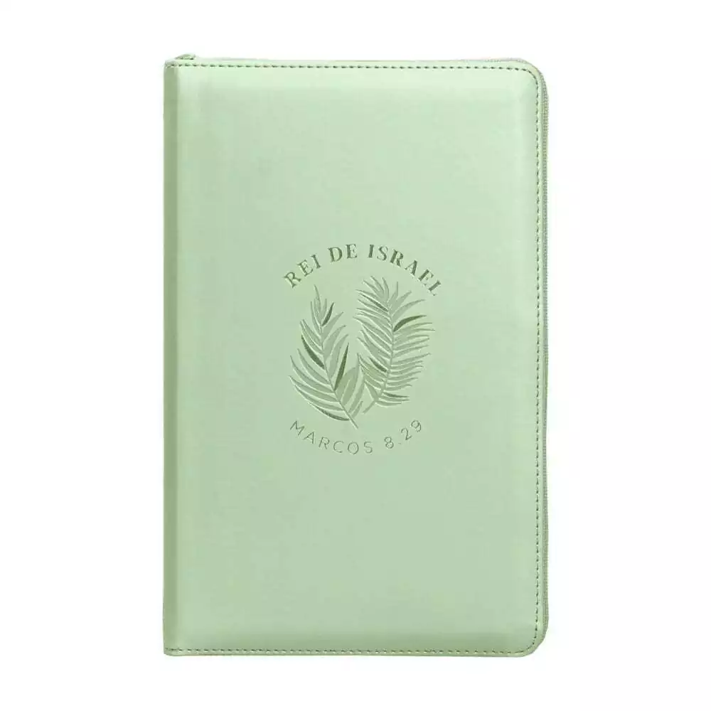 Parte da coleção de Bíblias A promessa, a capa Rei de Israel simboliza a chegada de Jesus a Jerusalém. As folhas de palmeira trazem alusão ao início da jornada de Cristo, que é recebido na cidade com folhas de palmeiras, trazendo reconhecimento da vinda de Cristo, o Salvador.