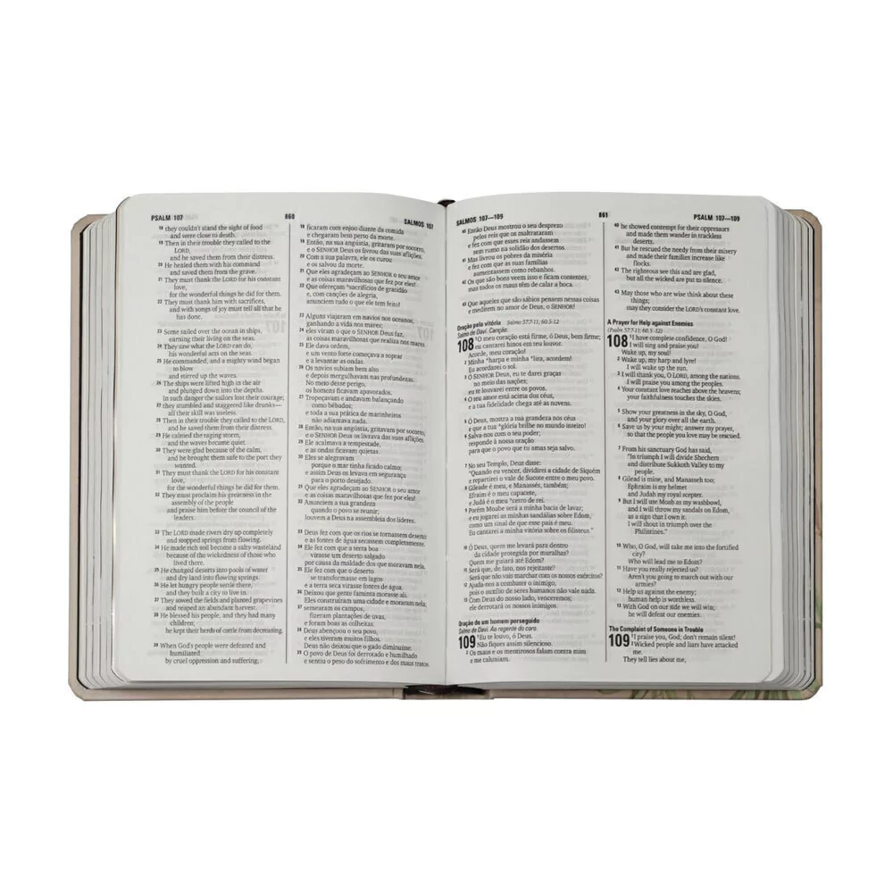 A disposição em duas colunas permite uma comparação direta dos textos bíblicos em ambas as línguas. Esta obra é perfeita para aqueles que desejam ler a Bíblia e, ao mesmo tempo, aprender ou se aprofundar no aprendizado desses idiomas. A edição também inclui um conjunto de 40 lâminas ilustradas, cada uma representando de forma única um texto bíblico.