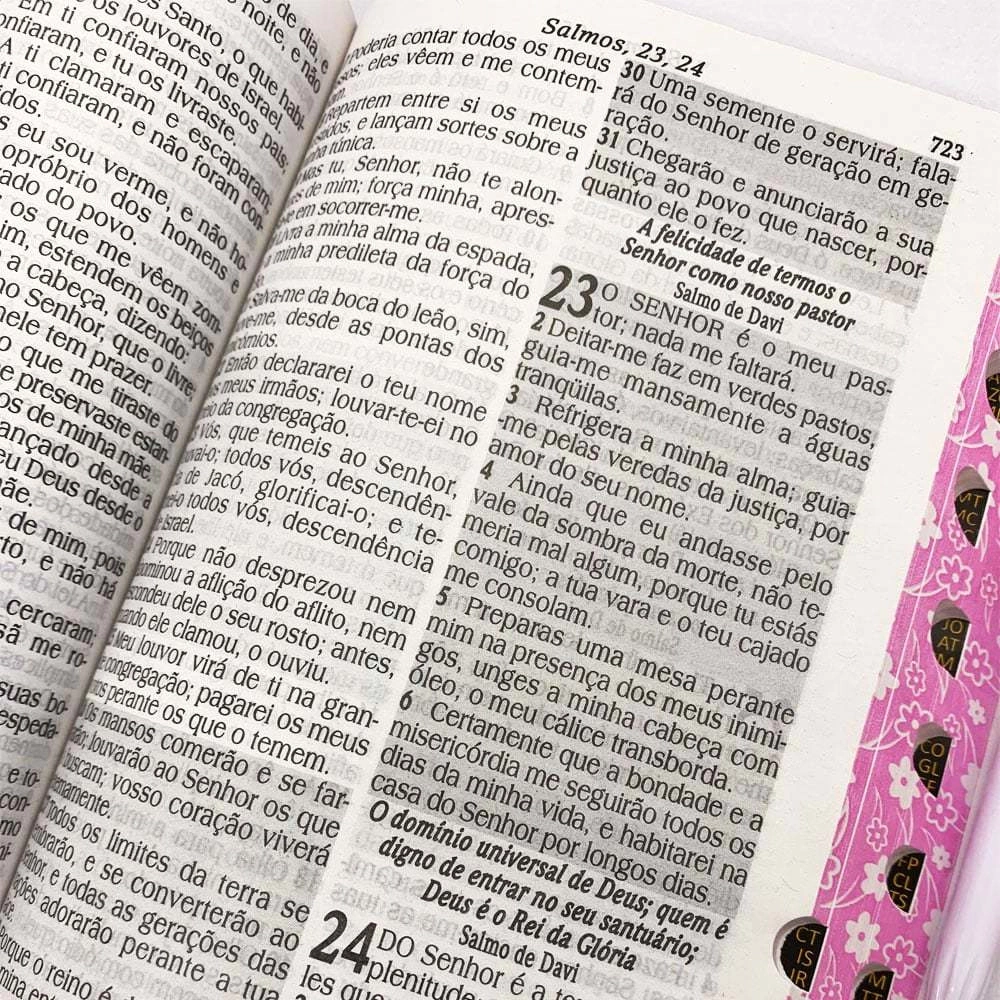 A mesma também possui índice nas laterais facilitando para os que tem certa dificuldade em encontrar livros menores como Sofonias por exemplo.