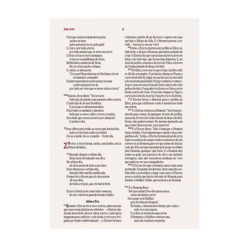 Inovadora, você encontrará, para cada dia, porções do Antigo Testamento, do Novo Testamento e de Salmos, além de um espaço para anotações ou imagens, de acordo com a sua criatividade. Você nunca leu a Bíblia assim antes!