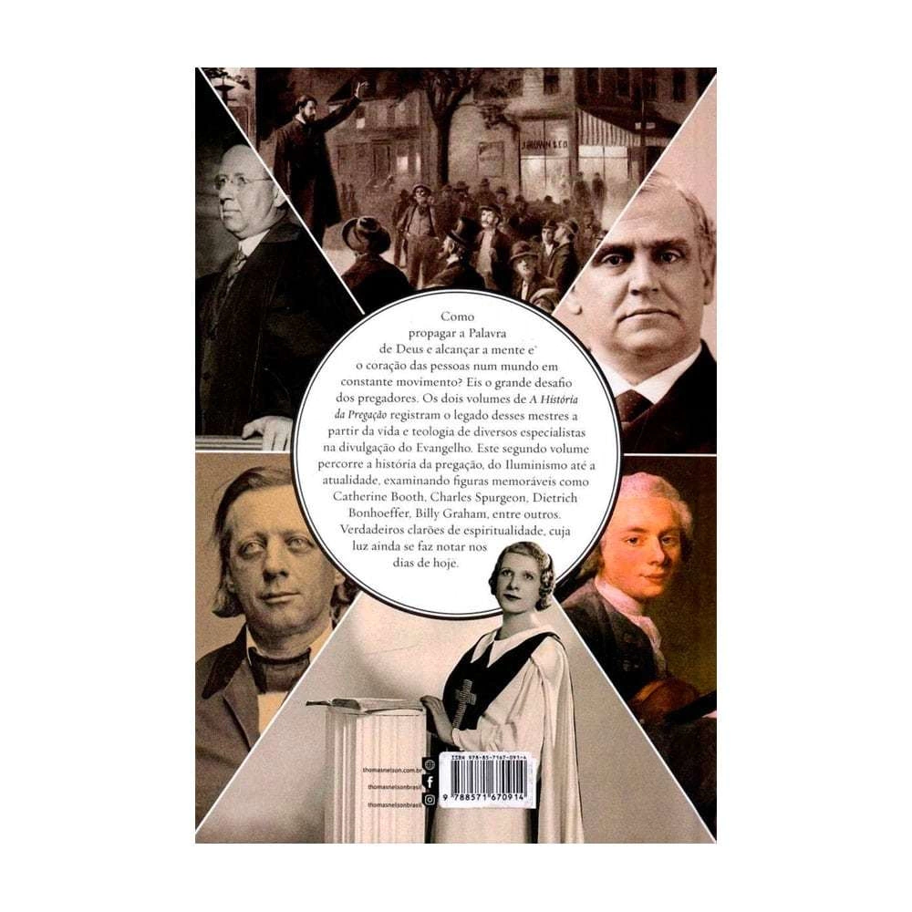 Anunciar o Evangelho é uma missão. Pregar a Palavra é uma arte. Como dar atualidade à Palavra de Deus e alcançar a mente e o coração das pessoas num mundo em constante movimento? Este que sempre foi um grande desafio para os pregadores aprofundou-se a partir do período turbulento do Iluminismo. Eles tiveram de desenvolver habilidades e recursos próprios para trazer à luz a verdade das Escrituras, encontrando inspiração frequentemente na rica tradição que remete aos primeiros apóstolos. Os dois volumes da História da pregação registram o legado desses mestres a partir da vida e da teologia de diversos especialistas na divulgação do Evangelho. Cada capítulo introduz o leitor a uma figura essencial da tradição homilética, apresentando o contexto de suas reflexões e indicando suas contribuições históricas fundamentais. Por sua abordagem individual, os textos expõem os problemas específicos e as soluções abrangentes de cada pregador, contando ainda com excertos exemplares de seus sermões. Leitura indispensável para pastores, evangelistas, missionários e seminaristas. Este segundo volume percorre a história da pregação a partir do período do Iluminismo até a atualidade, examinando figuras memoráveis como Charles Simeon, Catherine Booth, Charles Spurgeon, Rodney "Gipsy" Smith, John Jasper, Dietrich Bonhoeffer, Billy Graham, Martin Luther King Jr., entre outros. Verdadeiros clarões de espiritualidade, cuja luz ainda se faz perceber nos dias de hoje.