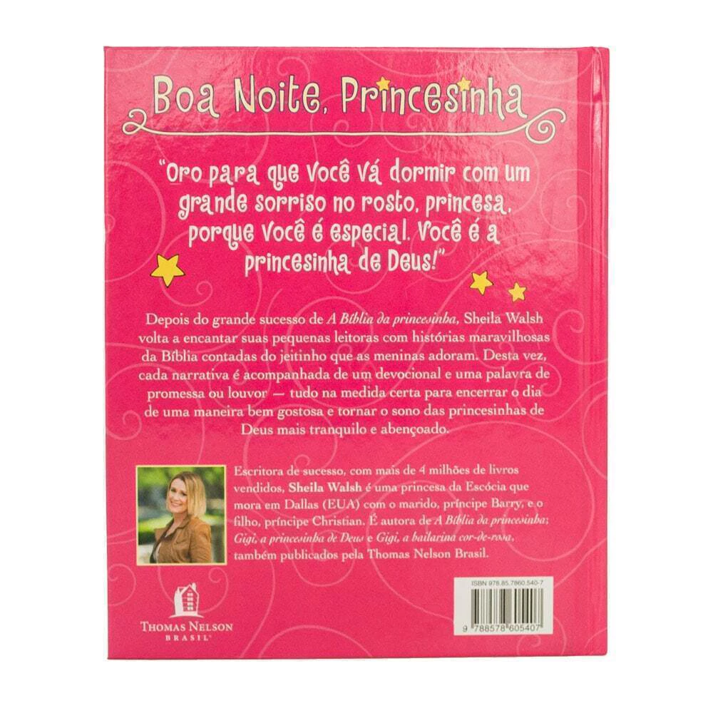 Boa noite, Princesinha, oro para que você vá dormir com um grande sorriso no rosto, princesa, porque você é especial. Você é aprincesinha de Deus!'Depois do grande sucesso de A Bíblia da princesinha, Sheila Walsh volta a encantar suas pequenas leitoras com histórias maravilhosas da Bíblia contadas do jeitinho que as meninas adoram. Desta vez, cada narrativa é acompanhada de um devocional e uma palavra de promessa ou louvor ― tudo na medida certa para encerrar o dia de uma maneira bem gostosa e tornar o sono das princesinhas de Deus mais tranquilo e abençoado.Escritora de sucesso, com mais de 4 milhões de livros vendidos, Sheila Walsh é uma princesa da Escócia que mora em Dallas (EUA) com o marido, príncipe Barry, e o filho, príncipe Christian. É autora de A Bíblia da princesinha, Gigi, a princesinha de Deus e Gigi, a bailarina cor-de-rosa, também publicados pela Thomas Nelson Brasil.