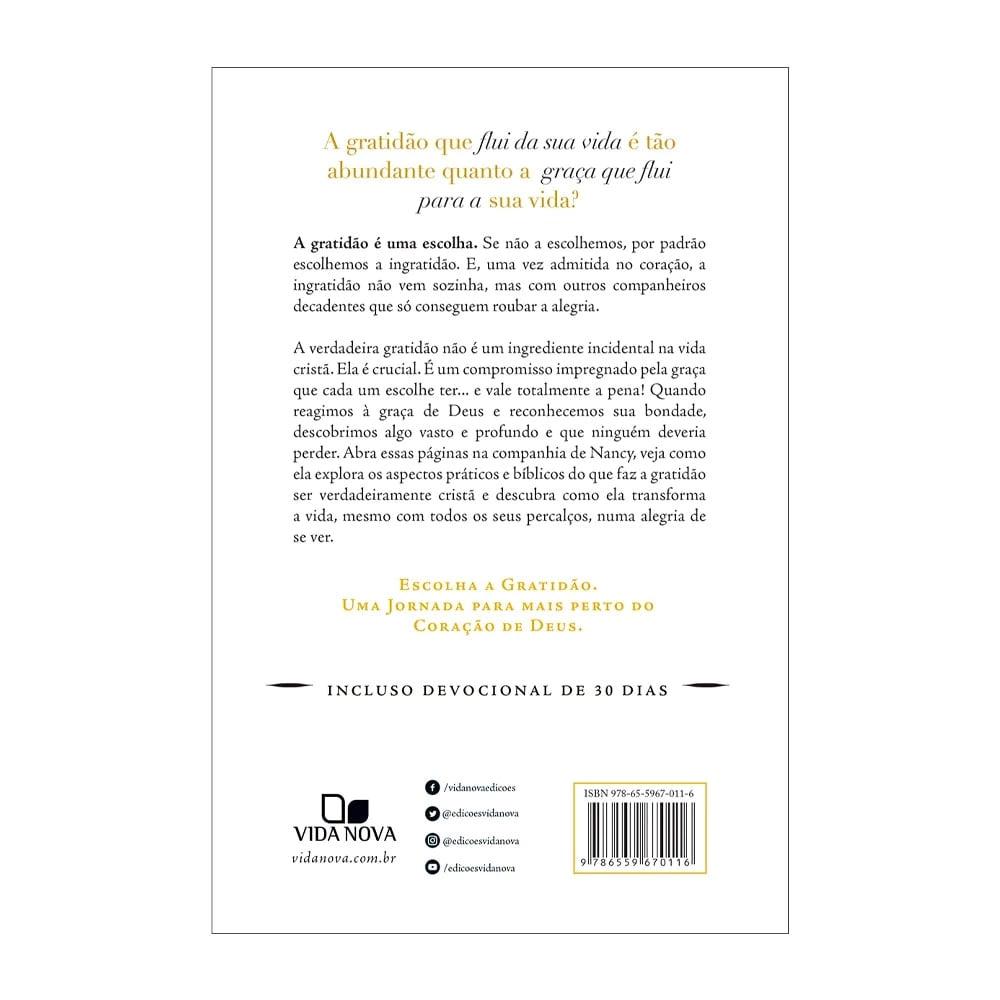 A verdadeira gratidão não é um ingrediente incidental na vida cristã. Ela é crucial. É um compromisso impregnado pela graça que cada um escolhe ter... e vale totalmente a pena! Quando reagimos à graça de Deus e reconhecemos sua bondade, descobrimos algo vasto e profundo e que ninguém deveria perder. Abra essas páginas na companhia de Nancy, veja como ela explora os aspectos práticos e bíblicos do que faz a gratidão ser verdadeiramente cristã e descubra como ela transforma a vida, mesmo com todos os seus percalços, numa alegria de se ver.