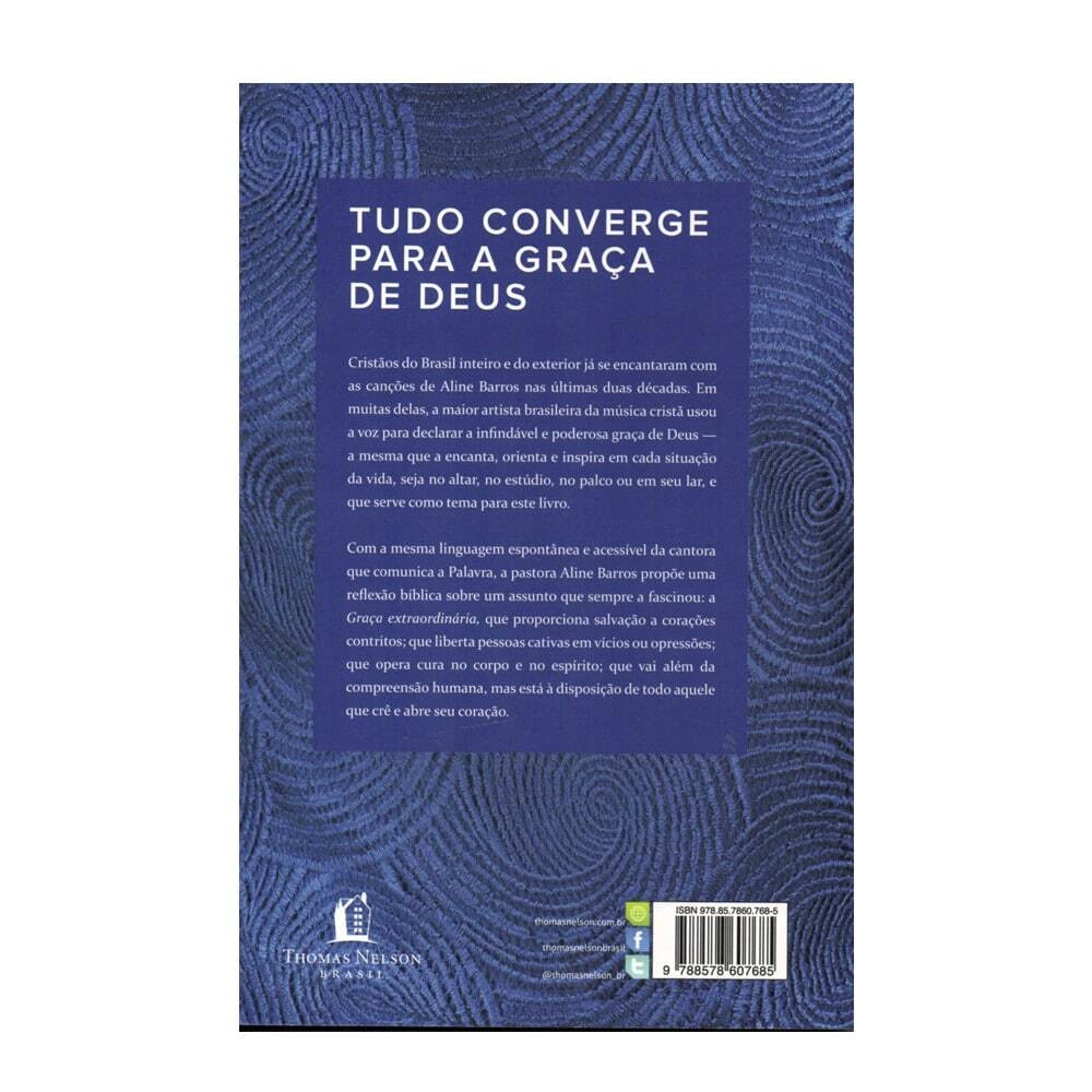 Com a mesma linguagem espontânea e acessível da cantora que comunica a Palavra, a pastora Aline Barros propõe uma reflexão bíblica sobre um assunto que sempre a fascinou: a Graça extraordinária, que proporciona salvação a corações contritos; que liberta pessoas cativas em vícios ou opressões; que opera cura no corpo e no espírito; que vai além da compreensão humana, mas está à disposição de todo aquele que crê e abre seu coração.