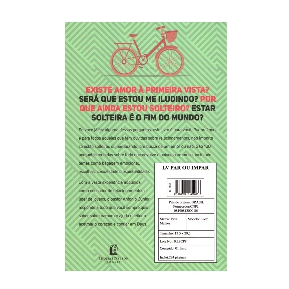 Existe amor à primeira vista? Será que estou me iludindo? Por que ainda estou solteiro? Estar solteira é o fim do mundo? Se você já fez alguma dessas perguntas, este livro é para você. O Livro Par ou ímpar de Antônio Junior é para todos aqueles que têm dúvidas sobre relacionamentos, não importa se estão solteiros ou namorando, em busca de um amor ou não.